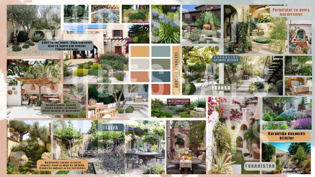 Akdeniz teması malumunuz Akdeniz ülkelerinin bitkisel ve topografik dokusunu içinde barındıran bir tema. Kayaların, doğal taşların, kurakçıl bitkilerin ve gölgelik alanların çokça mevcut olduğu bu tema, peyzaj ile bir araya gelince çok güzel bir kompozisyon yakalanıyor diyebilirim.